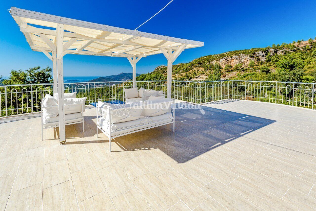 - Özel yüzme havuzu,güneş şemsiyesi,güneşlenme alanı,şezlonglar,bahçe yemek masası ve sandalyeler,barbekü bulunmaktadır.Açık hava jakuzisi bulunan havuzumuzda basamaklı manzaralı güneşlenme bölümü bulunmaktadır.